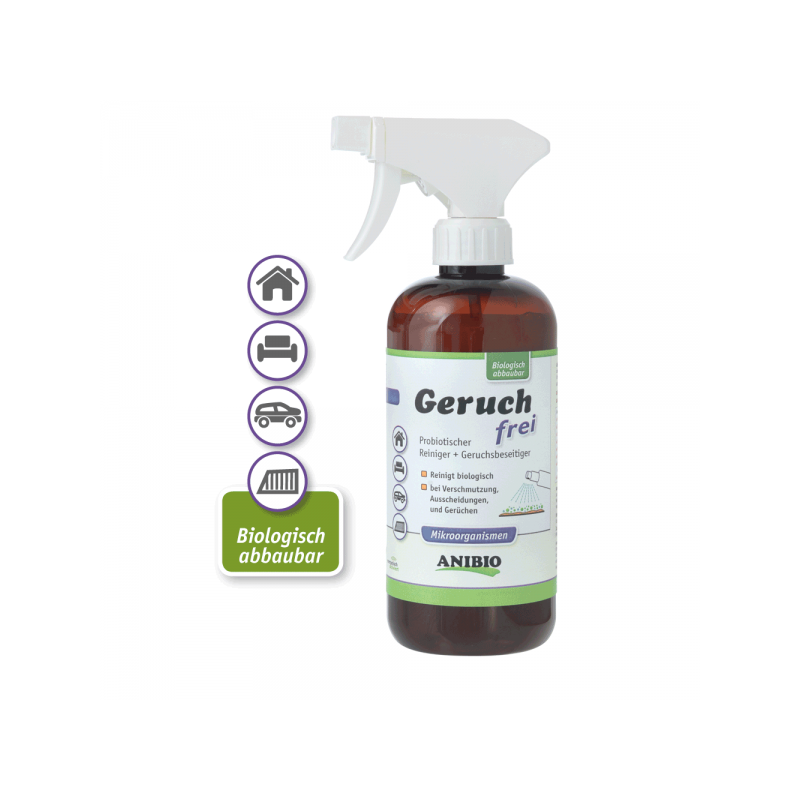 ANIBIO Odourless cleans dirt and removes sustainably all types of odour in an environmentally friendly way by the use of micro-organisms. Odours resulting from, for example, urine, faeces and other excrement can be removed naturally by using ANIBIO Odourless. Biologically degradable and environmentally harmless. Odourless is absolutely safe for people and animals.