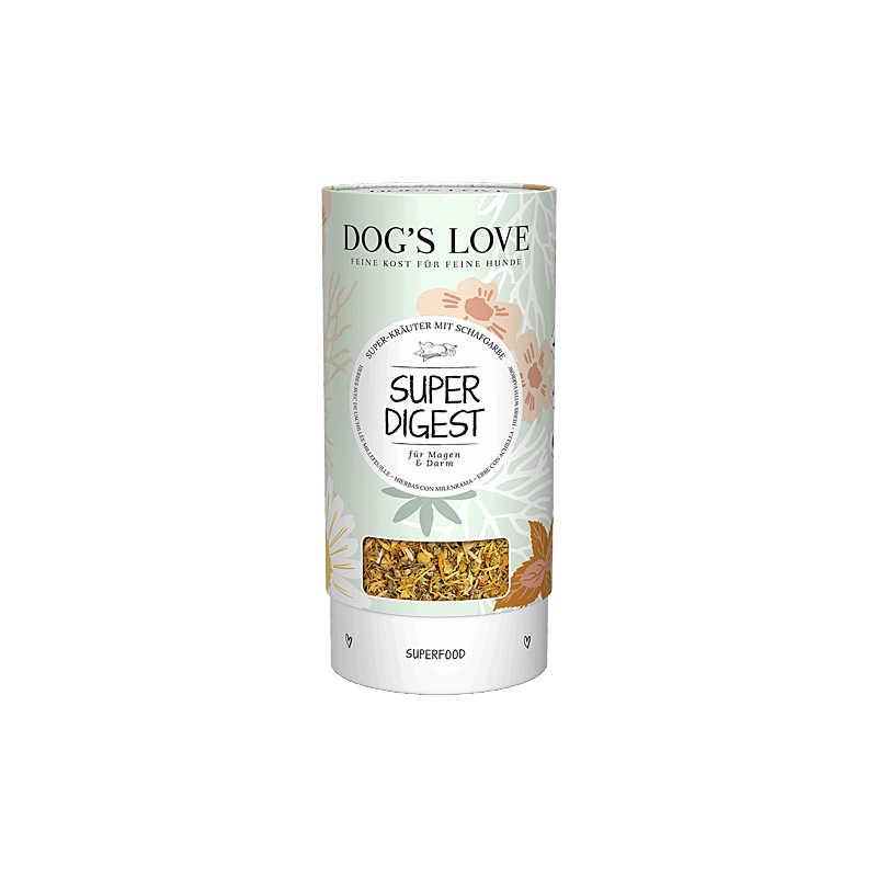 “Super Digest” herbal mix to achieve and maintain healthy, balanced gastrointestinal flora. Dietary supplement for dogs of all ages and breeds.