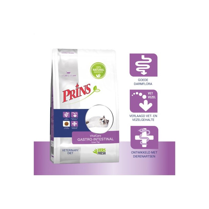 Prins VitalCare Veterinary Diet Gastro-Intestinal Low fat is a complete diet for cats with gastrointestinal disorders.