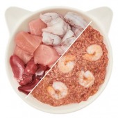 pollo e gamberetti 70% (di cui 60% pollo (composto da ventrigli di pollo, fegato di pollo, carne di pollo, cuore di pollo, collo di pollo, grasso di pollo) e gamberetti 10%), brodo 29%, minerali 1%.