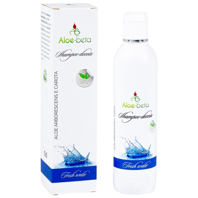Lo shampoo-doccia fresh water Aloe-beta® con Aloe Arborescens agisce sui capelli e sul corpo in modo delicato, deterge efficacemente e lascia un gradevole profumo.