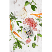 COMPOSIZIONE: Carne di pollo bio 61 %, carote bio 10 %, sedano bio 10 %, broccoli bio 8 %, semi di grano saraceno bio 4 %, sali minerali, alghe marine, basilico bio, olio di girasole.