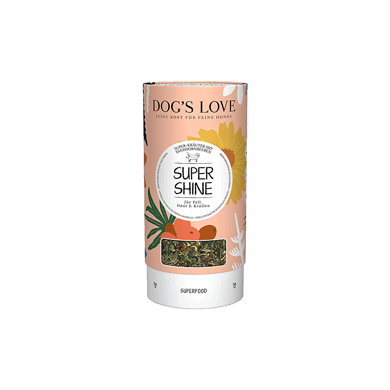 Miscela di erbe “Super Shine” per mantenere un pelo lucido, una cute sana e unghie forti. Mangime complementare per cani di ogni età e ogni razza.